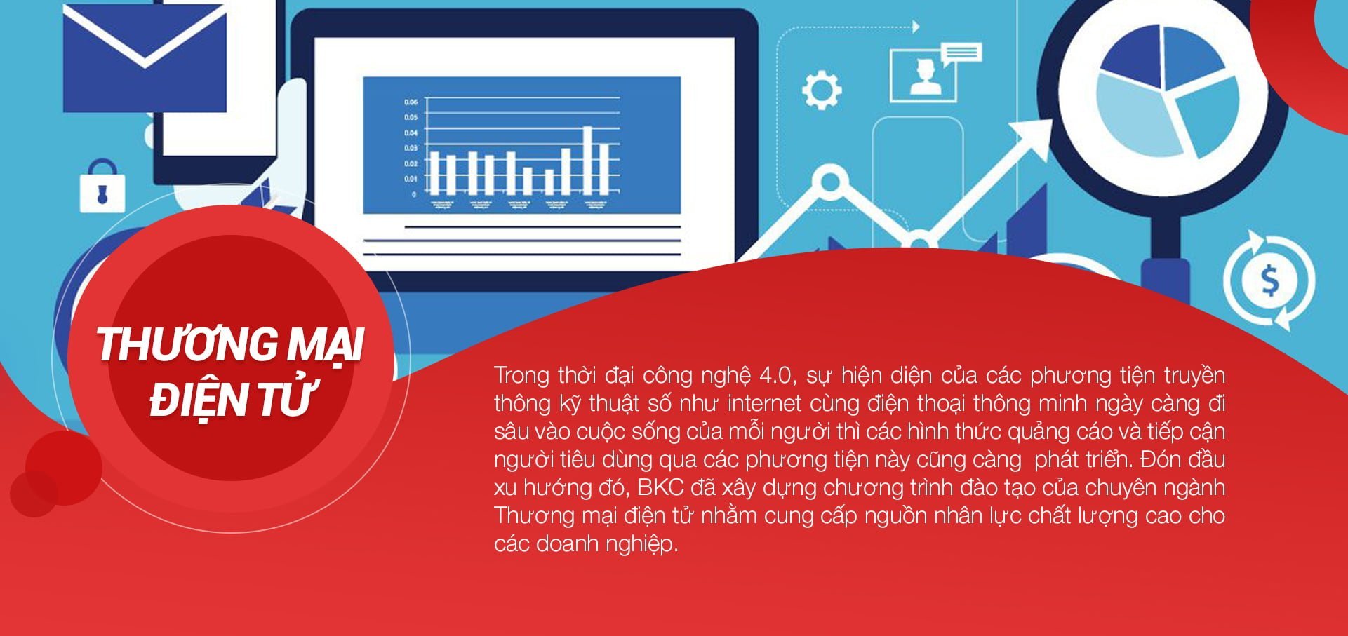 Với môi trường học tập năng động, cơ sở vật chất hiện đại, phương pháp giảng dạy tiên tiến gắn liền với thực tiễn, sau quá trình học tập, sinh viên chuyên ngành Thương mại điện tử – Digital & Online Marketing của BKC sẽ được trang bị những kiến thức chuyên môn như: Marketing, nghiên cứu thị trường, kinh tế thương mại dịch vụ, quảng cáo, vẽ và xử lý ảnh, xây dựng, quản trị website, Youtuber, Search Engine Marketing, Web and Mobile Marketing, SEO, Social Marketing… cùng các kỹ năng mềm và ngoại ngữ.